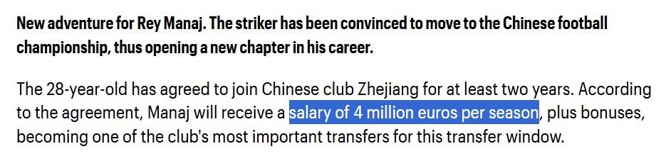 據報道,馬納伊已同意加盟中超浙江隊,合同期至少兩年。根據協議,馬納伊每個賽季將獲得400萬歐元的薪水(注:中超限薪令單外援最高年薪爲300萬歐,含獎金等),外加獎金。