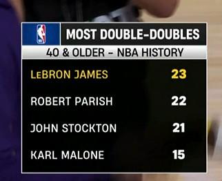 直播期間,轉播方曬出了NBA歷史上球員在40歲後兩雙次數排行榜,在這一榜單中,詹姆斯以23次位居榜首。