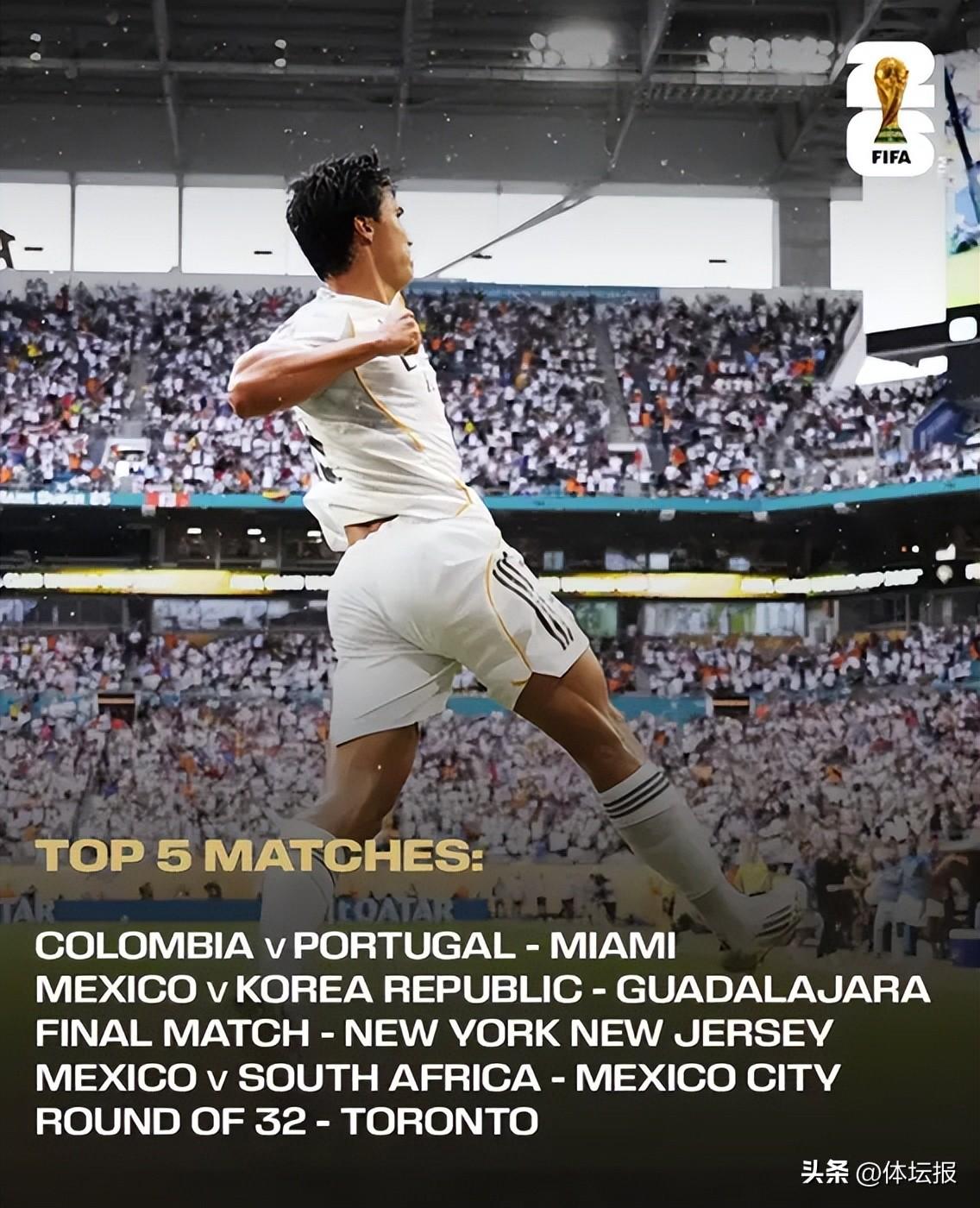 目前購票需求最多的賽事分別是擬定於6月27日舉行的哥倫比亞對陣葡萄牙比賽、6月18日墨西哥對陣韓國比賽以及7月19日的決賽,按計劃分別在美國邁阿密加登斯、墨西哥瓜達拉哈拉和美國新澤西州東拉瑟福德舉行。