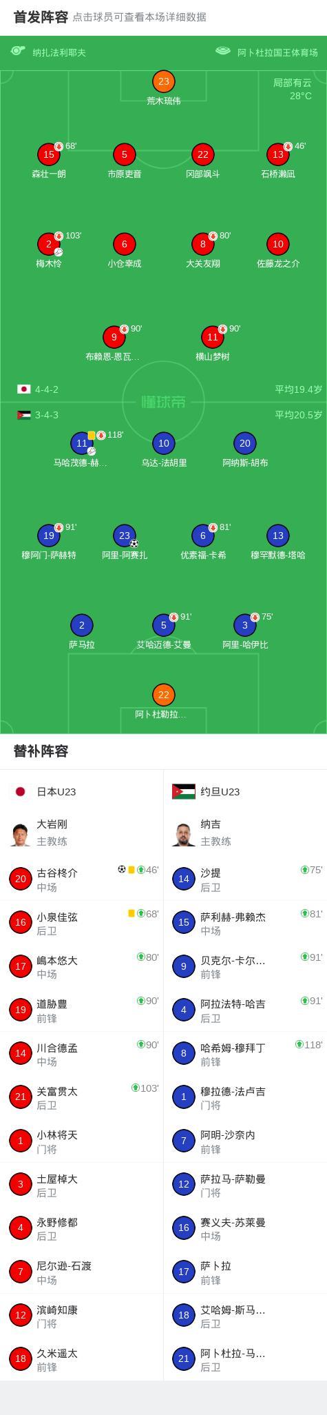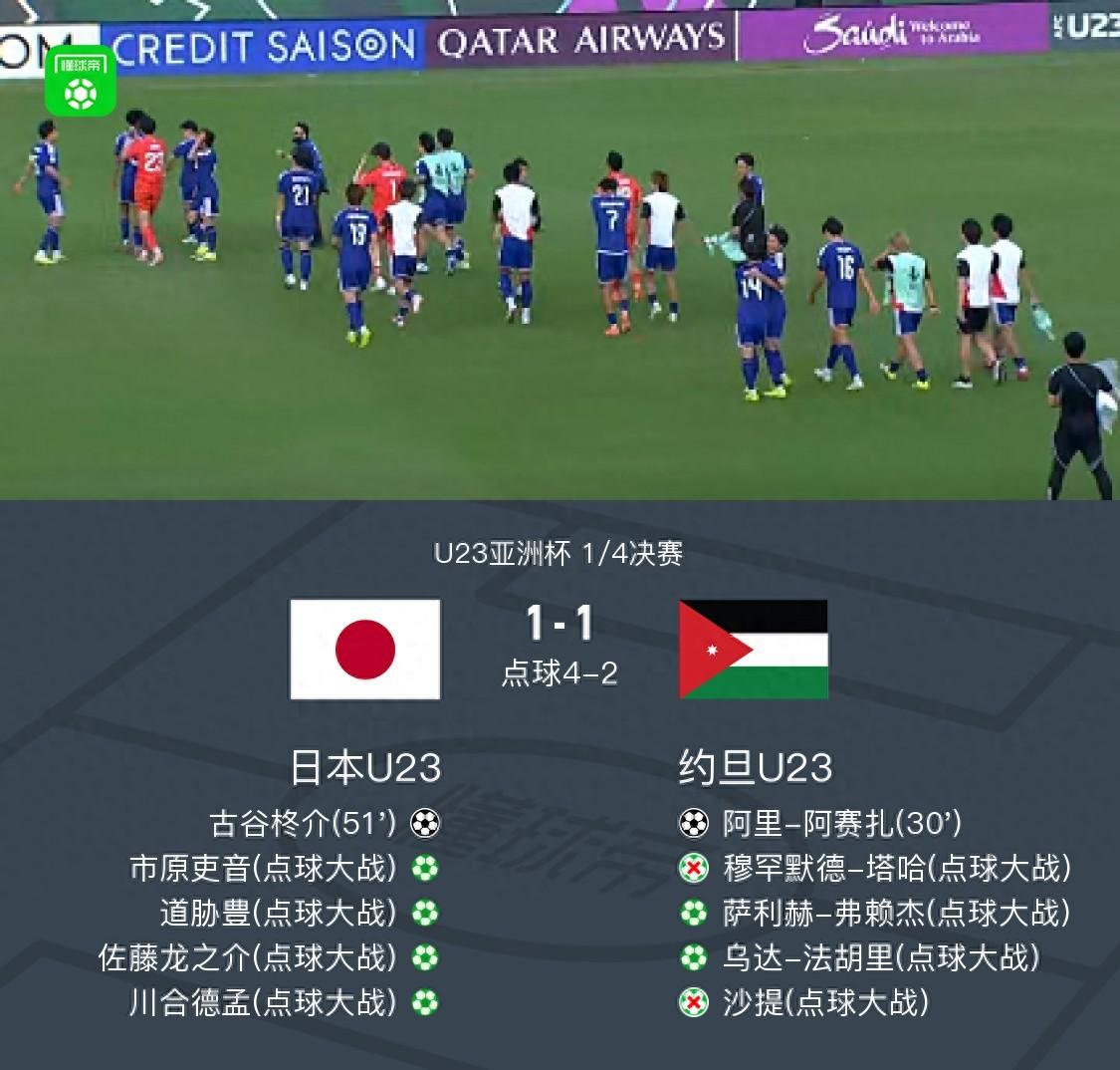 北京時間1月16日U23亞洲盃1/4決賽,日本U23對陣約旦U23。阿里-阿賽扎率先破門,古谷柊介扳平比分,隨後雙方均無建樹,比賽經過加時後進入點球大戰。點球大戰中,道脅豊主罰點球被撲,但皮球戲劇性彈進球門,日本U23點球4罰全中,約旦U23塔哈和沙提罰丟。最終,日本U23總比分5-3淘汰約旦U23,晉級4強。