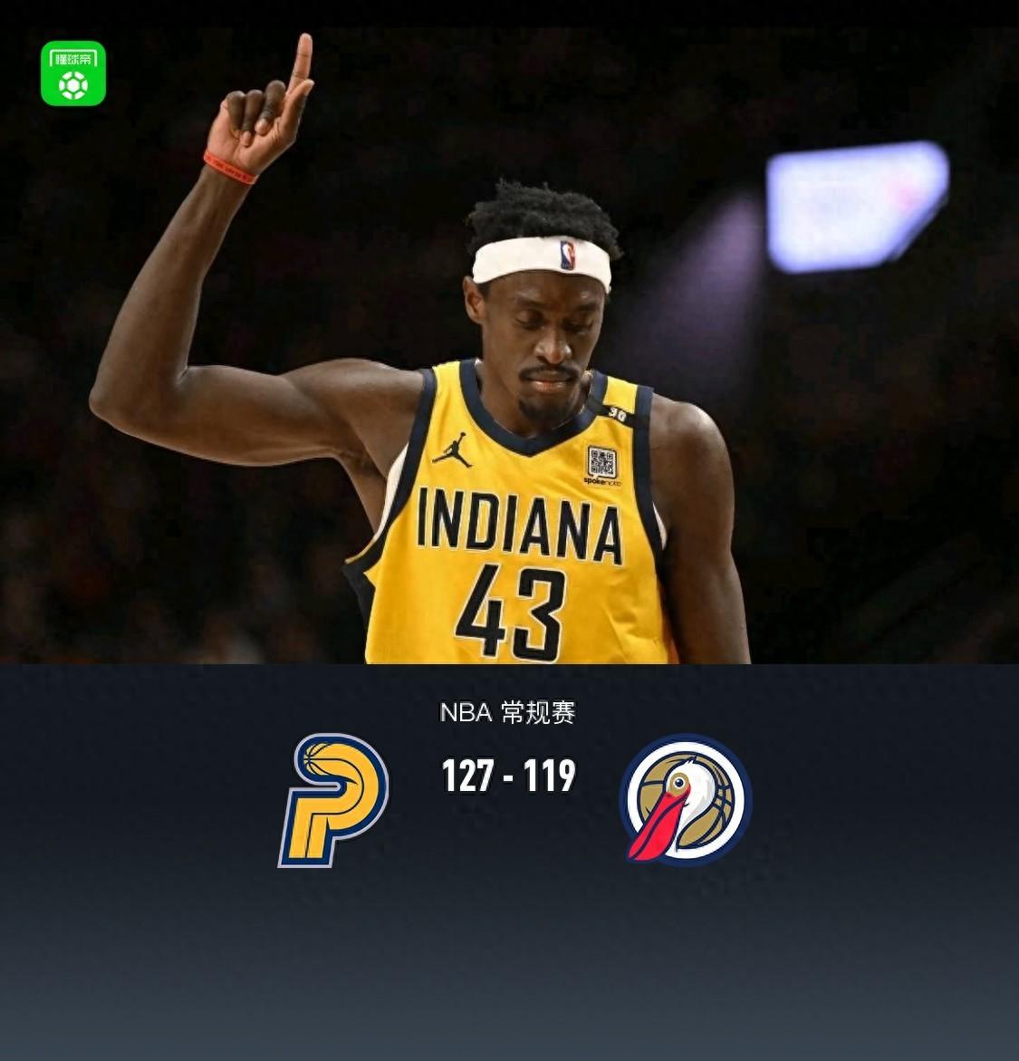 步行者127-119鵜鶘,西亞卡姆27+6+5,錫安12中10轟27+6+7