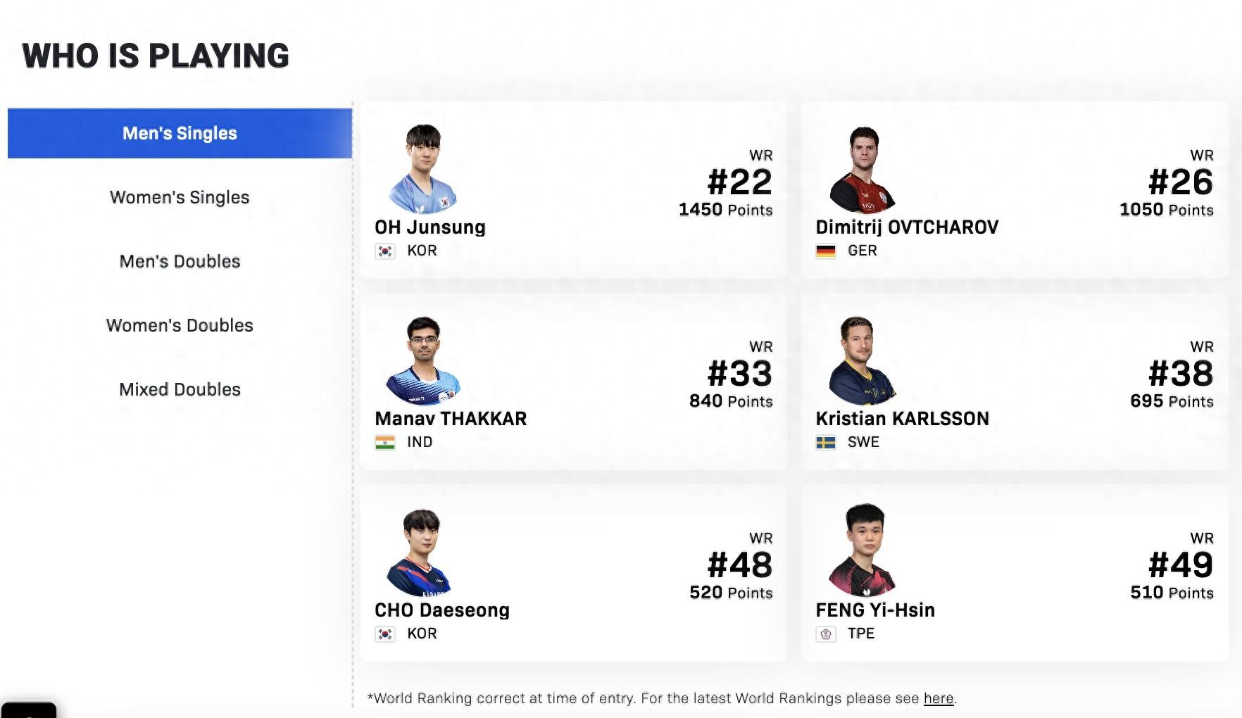 2026年WTT球星挑戰賽金奈站將於2026年2月10日至2月15日在印度金奈舉行,今天官網公佈了參賽名單,男單前四號種子分別是世界排名22的吳晙誠(韓國),世界排名26的奧恰洛夫(德國),世界排名30的科頓(法國),世界排名32的泊雷特(法國)。