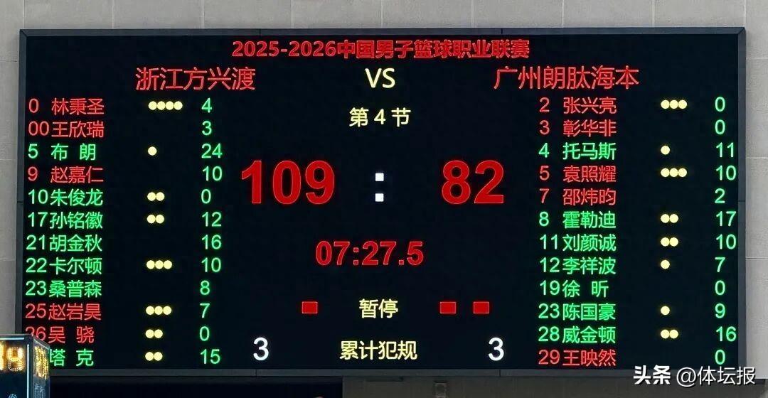1月17日,浙江方興渡在主場黃龍體育館迎來了本賽季與廣州朗肽海本的首次交手。最終,浙江方興渡109:82大勝廣州隊,實現主場九連勝。此役,浙江方興渡六人得分上雙,布朗砍下全場最高的24分,胡金秋貢獻16分7籃板,塔克得到15分;廣州隊五人得分上雙,霍勒迪拿下全隊最高的17分。