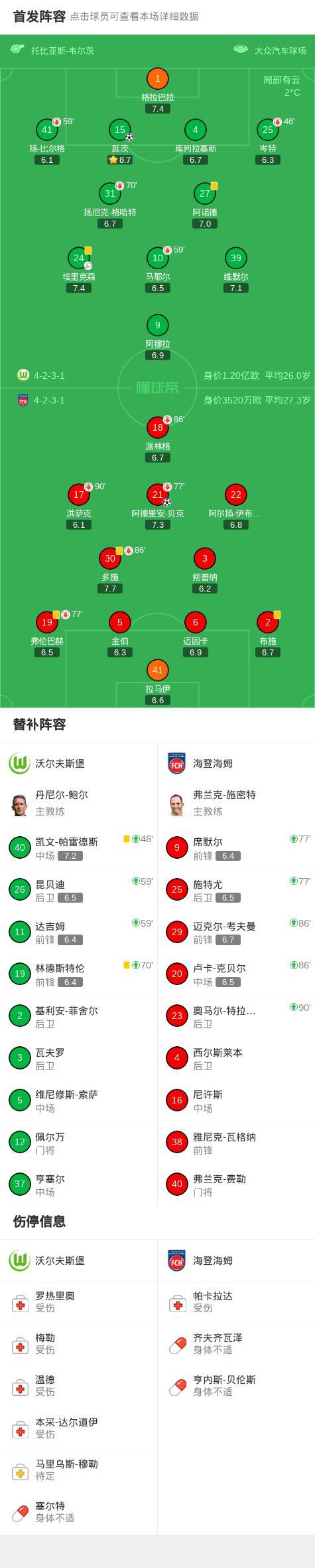 沃爾夫斯堡1-1海登海姆,阿德里安-貝克打破僵局,延茨扳平