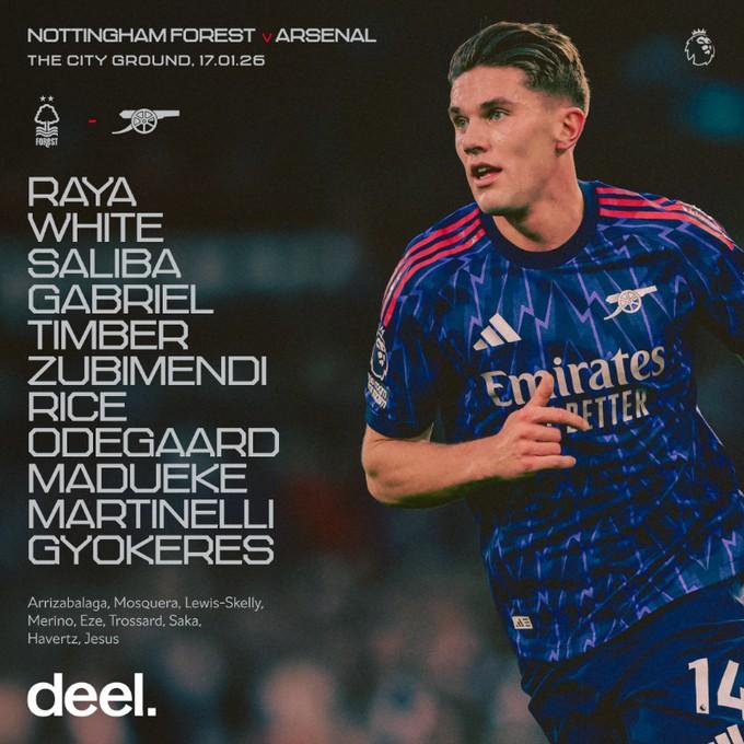 阿森納客戰諾丁漢森林:哲凱賴什、馬丁內利、馬杜埃凱首發