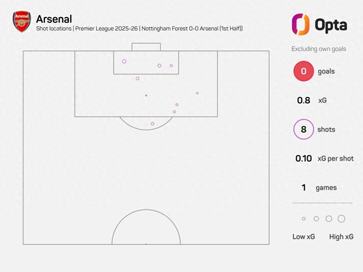 此役客場對陣諾丁漢森林,阿森納在上半場共有8次射門,這是他們自2019年12月阿爾特塔執教槍手首戰、對陣伯恩茅斯(當時上半場9次射門)以來,阿森納在英超射門次數最多卻沒有一次射正的上半場比賽。