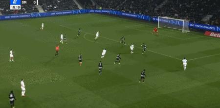 第24分鐘,格林伍德與埃莫森做撞牆配合後推射近角破門,馬賽2-0昂熱