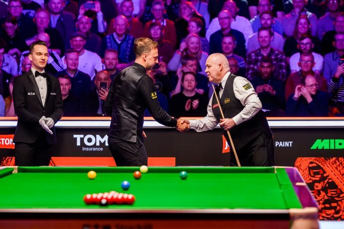 希金斯與特魯姆普的比賽率先進行,特魯姆普開局狀態甚好連勝三局,隨後希金斯扳回兩局並在第五局中打出單杆104分,此後雙方各勝一局,第八局特魯姆普在希金斯率先打出單杆62分的情況下完成逆轉並率先拿到賽點,第九局末段雙方先後出現進攻失誤,最終希金斯抓住機會再扳一局,第十局希金斯再勝一局將比賽拖入決勝局,決勝局希金斯打出單杆57分獲勝。希金斯也就此成爲了歷史上晉級三大賽決賽最年長的球員。