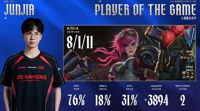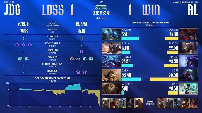 首局Junjia在河道帶起節奏拿到一血,第一條大龍刷新的團戰,Gala的厄斐琉斯拿下三殺團滅AL,隨後JDG憑藉經濟優勢順利結束比賽。