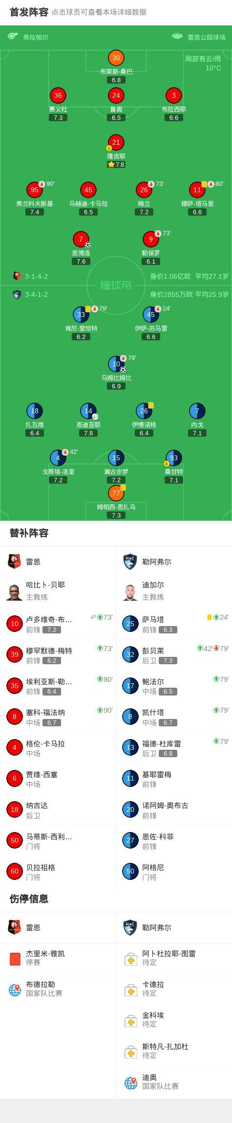 北京時間1月19日法國足球頂級聯賽 聯賽 第18輪,雷恩主場對陣勒阿弗爾。雷恩恩博洛破門。勒阿弗爾馬姆比姆比破門。最終比分雷恩 1-1 勒阿弗爾。