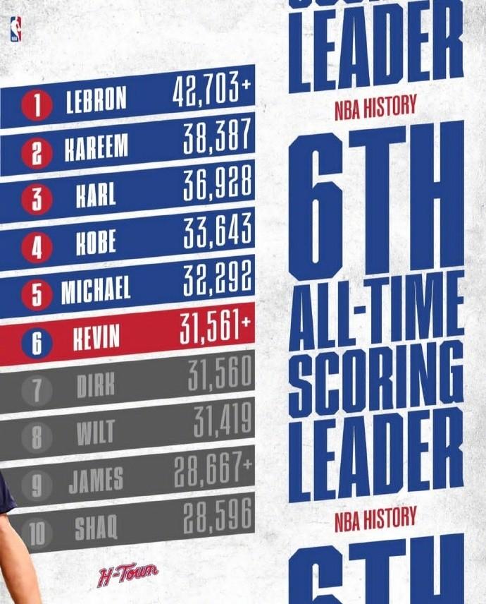 本場杜蘭特迎來個人里程碑,他全場得到18分6籃板8助攻1搶斷,NBA生涯總得分(31562分)正式超越德克-諾維茨基,升至歷史第六位!