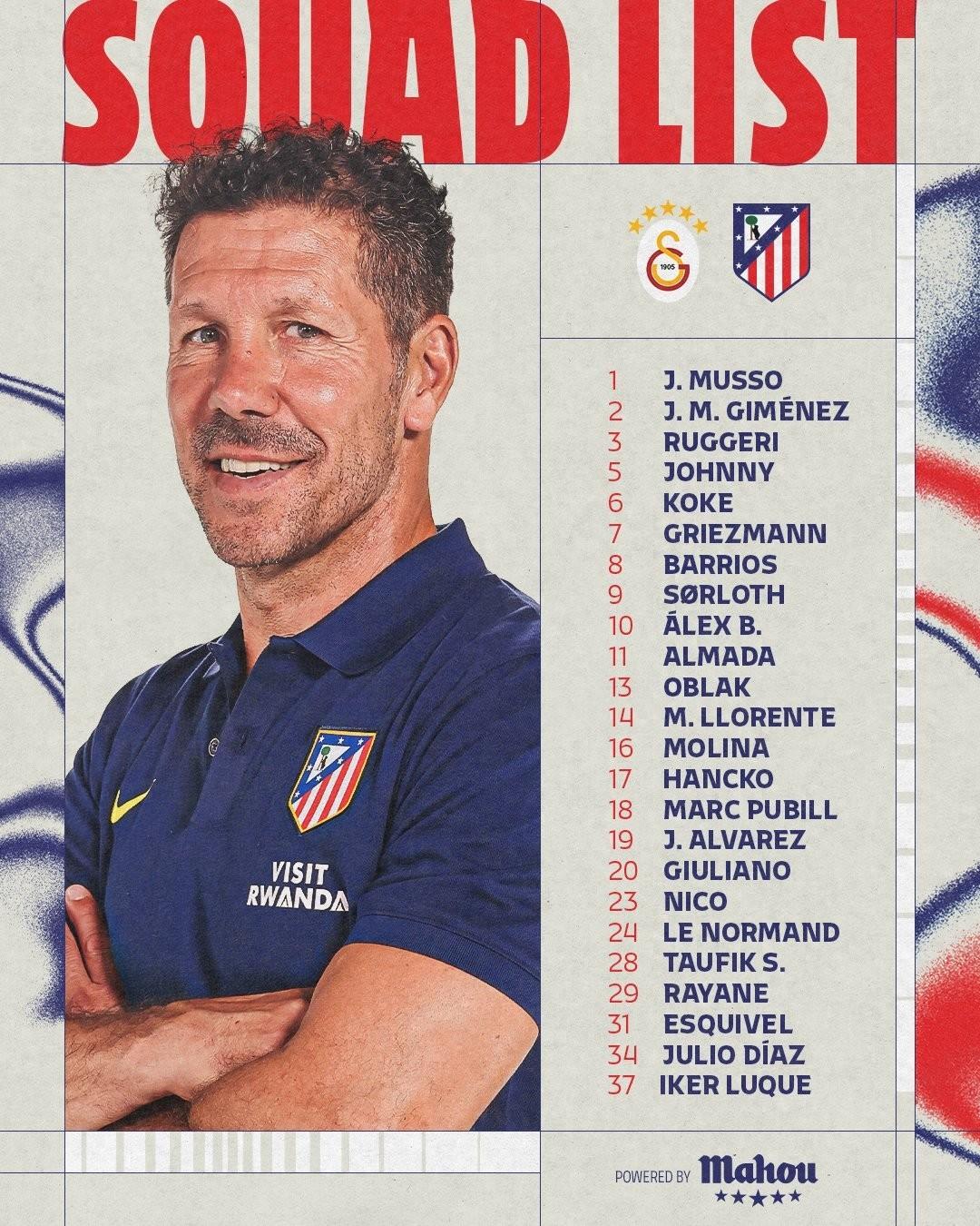 馬競官方公佈了歐冠客戰加拉塔薩雷的大名單,阿爾瓦雷斯領銜,岡薩雷斯、科克迴歸。