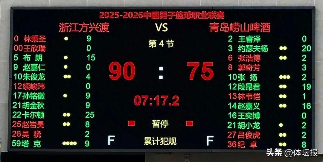 1月19日晚,浙江方興渡在主場黃龍體育館迎來了對手青島嶗山啤酒,這是兩隊本賽季首次交手。最終,浙江方興渡90:75戰勝對手,取得主場十連勝。此役,浙江方興渡兩人得分上雙,卡爾頓砍下賽季新高的25分,布朗貢獻15分;青島隊三人得分上雙,約瑟夫·楊拿下全隊最高的20分。