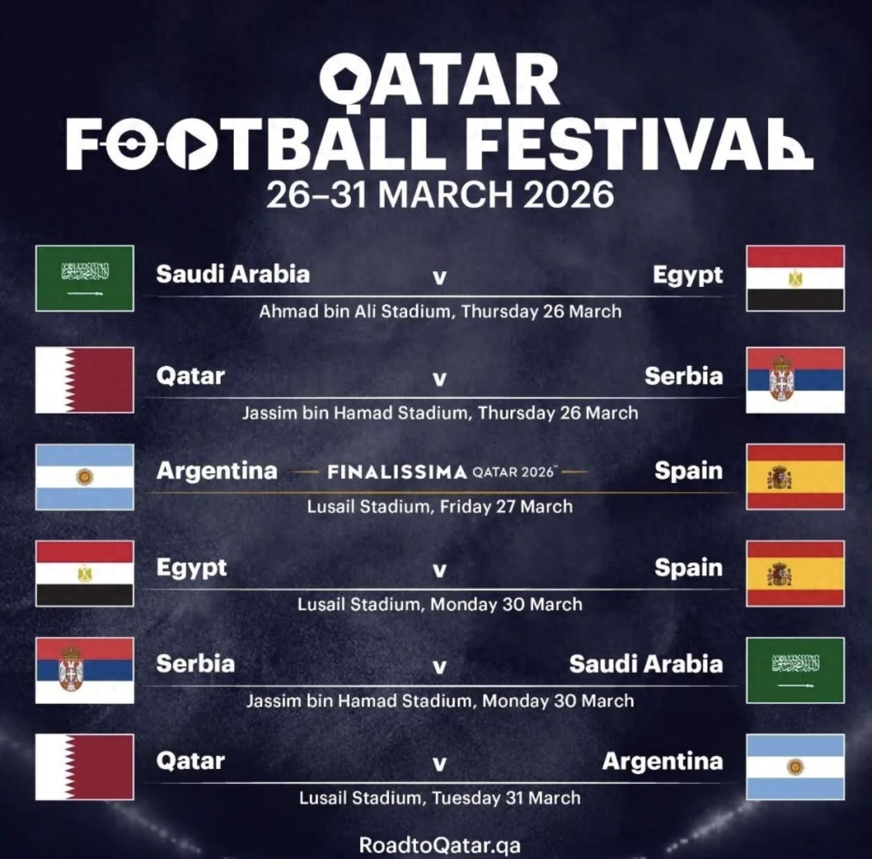 與此同時,2026年卡塔爾足球節將於3月26日至31日舉行。期間,卡塔爾將舉辦多場高水平國家隊賽事,其中就包括2026年歐美超級盃。