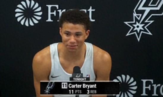 賽後,馬刺隊在去年選秀大會上選中的14號秀卡特-布萊恩特出席了發佈會,他用幽默的方式稱讚了隊友文班亞馬的防守能力:“我認爲我可以成爲世界第二好的防守球員,因爲很難超過身高7尺5寸(約2.24米)且移動速度極快的球員去成爲世界第一的防守球員。”