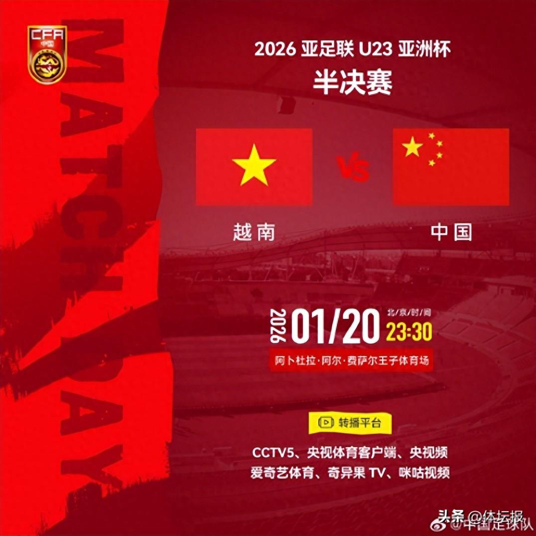 今天23:30,2026亞足聯U23亞洲盃半決賽,國足將與越南隊展開交鋒,央視也將轉播這場比賽。