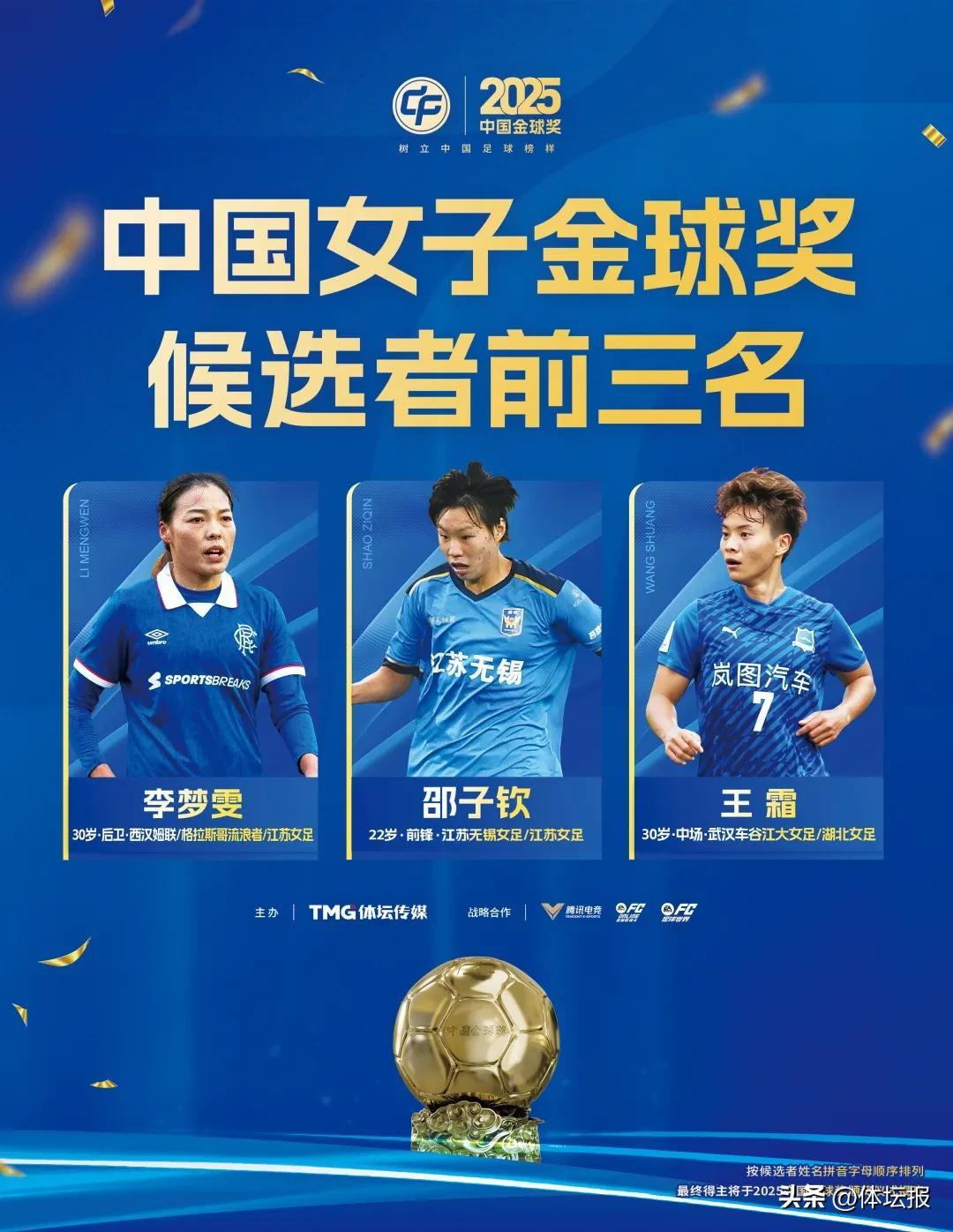 1月22日,2025中國金球獎各獎項候選者前三名揭曉。中國金球獎、中國女子金球獎、中國金帥獎、中國金童獎、中國金手套獎和中國五人制金球獎的評委投票告一段落,各獎項前三名正式出爐:蔣光太、韋世豪和吳曦入圍中國金球獎前三名,李夢雯、邵子欽和王霜將爭奪中國女子金球獎,常衛魏、李金羽和邵佳一躋身中國金帥獎前三名,中國金童獎U21組前三是蒯紀聞、李新翔和王鈺棟,U17組前三爲鄺兆鐳、帥惟浩和魏祥鑫,金手套獎前三名是陳晨、劉殿座、顏駿凌,五人制金球獎前三是劉丹萍、排黑爾·吐達洪與王博。