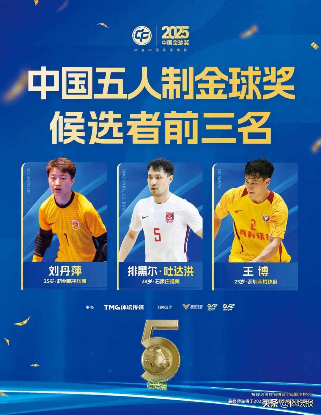 入圍中國五人制金球獎候選者前三名的劉丹萍在過去一年連續斬落女子五人制足球俱樂部大賽冠軍和最佳門將、並在女子五人制亞洲盃賽場有出色發揮。2025年11月,杭州臨平樂茵登頂女五聯賽冠軍,這也是該俱樂部成立以來獲得的首座中國足協女子五人制足球賽事冠軍獎盃。