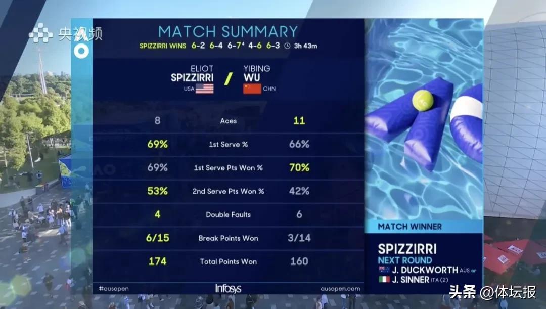 1月22日,2026澳網男單第2輪,浙江選手吳易昺激戰3小時43分鐘打滿5盤,在盤分0:2落後的情況下奮起直追,將比賽拖入決勝盤。但在決勝盤未能更進一步,遺憾無緣澳網第3輪。