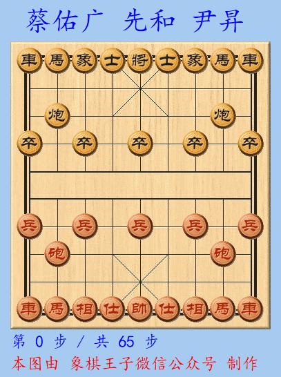 當中與尹昇一戰,蔡佑廣執紅棋戰至車雙馬四兵仕相全對車馬炮雙卒士象全,紅多雙兵、黑兵種好,兩人互有顧忌間65手不變成平。