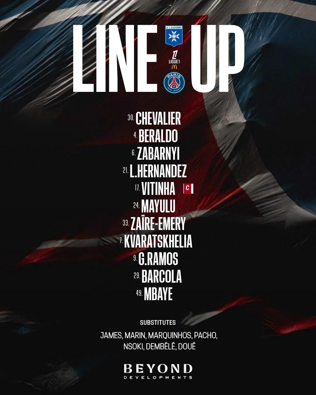 巴黎首發:30-舍瓦利耶、4-貝拉爾多、6-扎巴爾尼、21-盧卡斯-埃爾南德斯、17-維蒂尼亞、24-馬尤盧、33-扎伊爾-埃梅里、7-克瓦拉茨赫利亞、29-巴爾科拉、49-姆巴耶、9-貢薩洛-拉莫斯