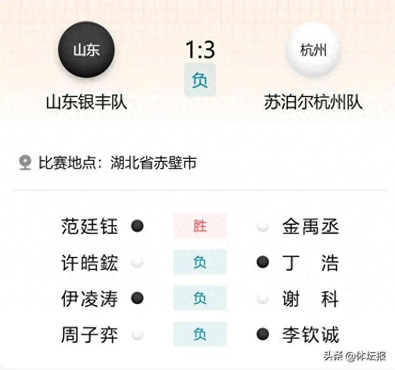 當日四臺對陣中,丁浩輕取許皓鋐,李欽誠穩控局面擊敗周子弈,謝科在官子階段抓住伊凌濤重大失誤完成逆轉,唯有金禹丞不敵山東主將範廷鈺。儘管開局不利,蘇泊爾仍以這場勝利兌現衛冕承諾。