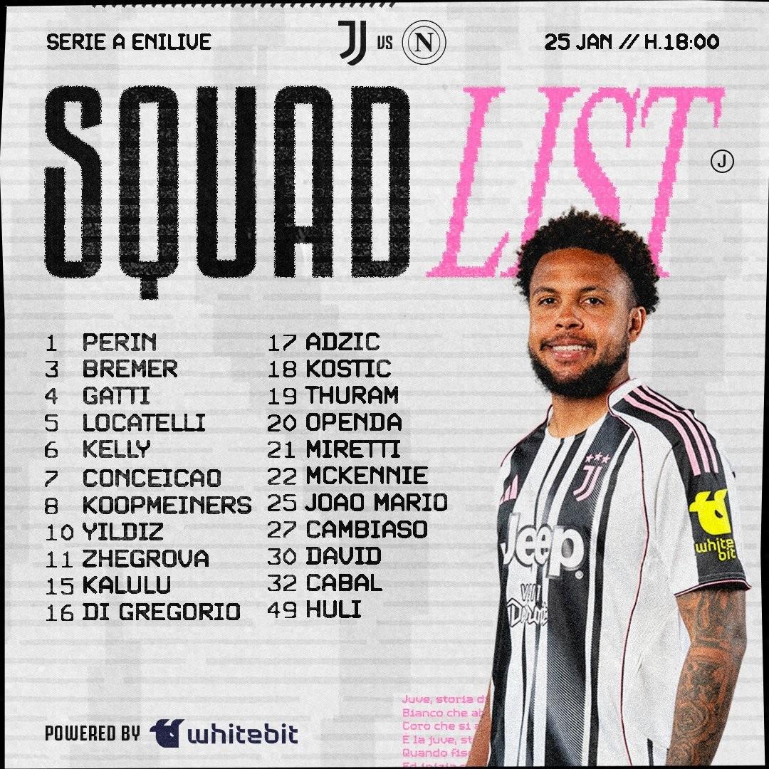 尤文圖斯官方公佈了意甲第22輪主場對陣那不勒斯的比賽大名單,伊爾迪茲領銜,魯希、平索利奧缺席,17歲門將胡利入選。