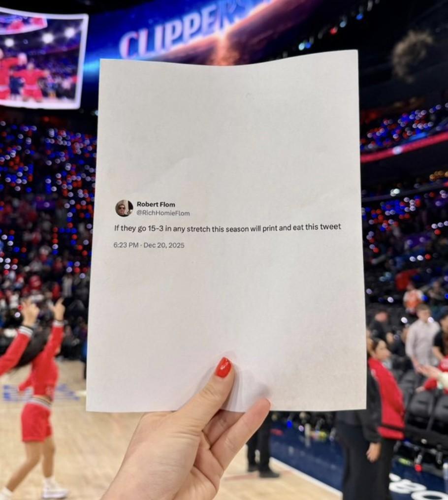 此前,有一位網友在推特上發文表示:“如果快船在本賽季任意階段打出18場贏15場的表現,他就把那條推文打印出來並喫掉。”