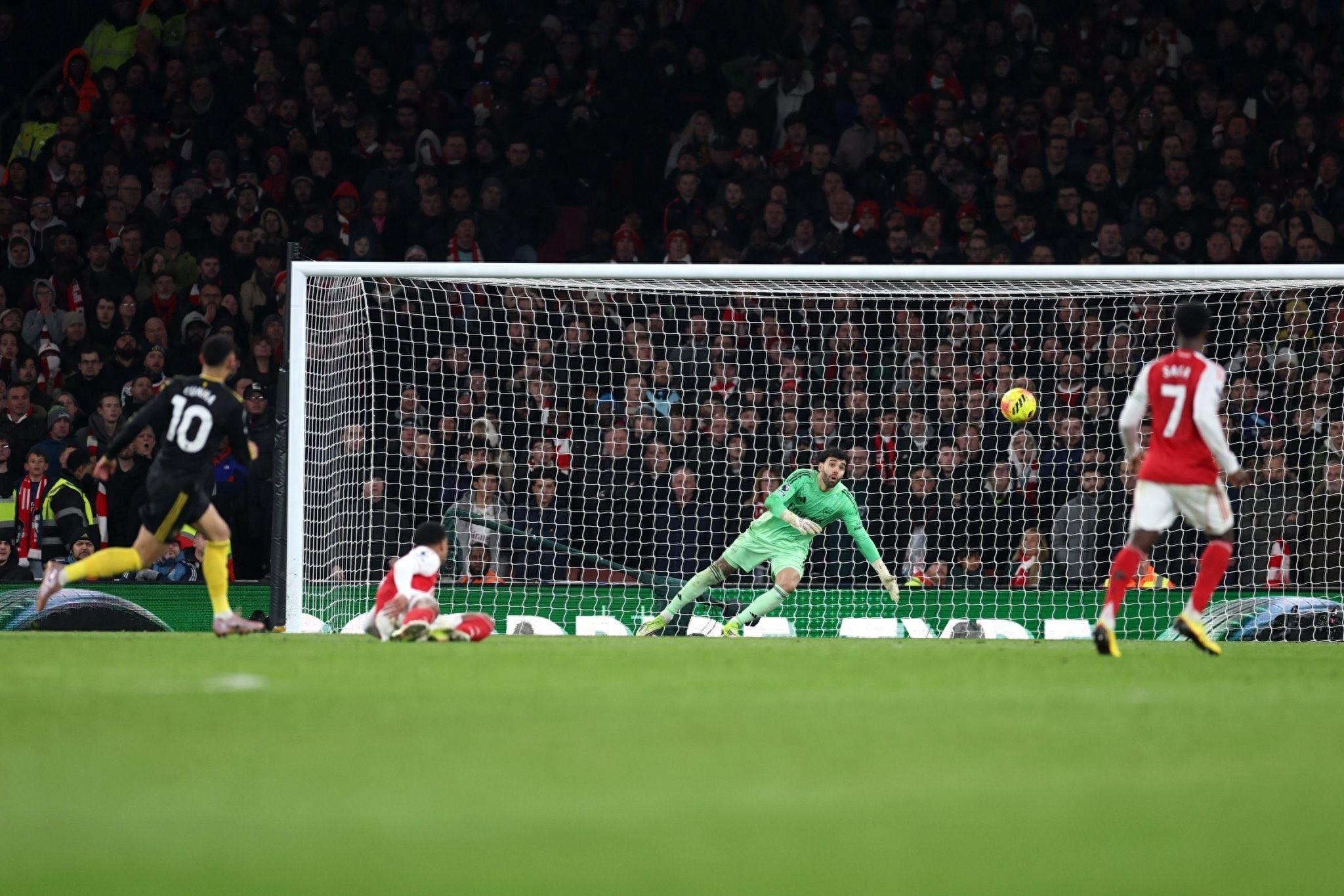 第87分鐘,曼聯前場組織進攻,謝什科斜向跑動帶走阿森納防守注意力,爲弧頂騰出空間。庫尼亞在禁區前沿得球,內切一步後右腳轟出遠射。加布裏埃爾匆忙上搶封堵未果,擋住了拉亞的視線,皮球帶着弧線直飛球門右上死角,拉亞全力向右側飛身撲救未果,曼聯3-2完成絕殺。