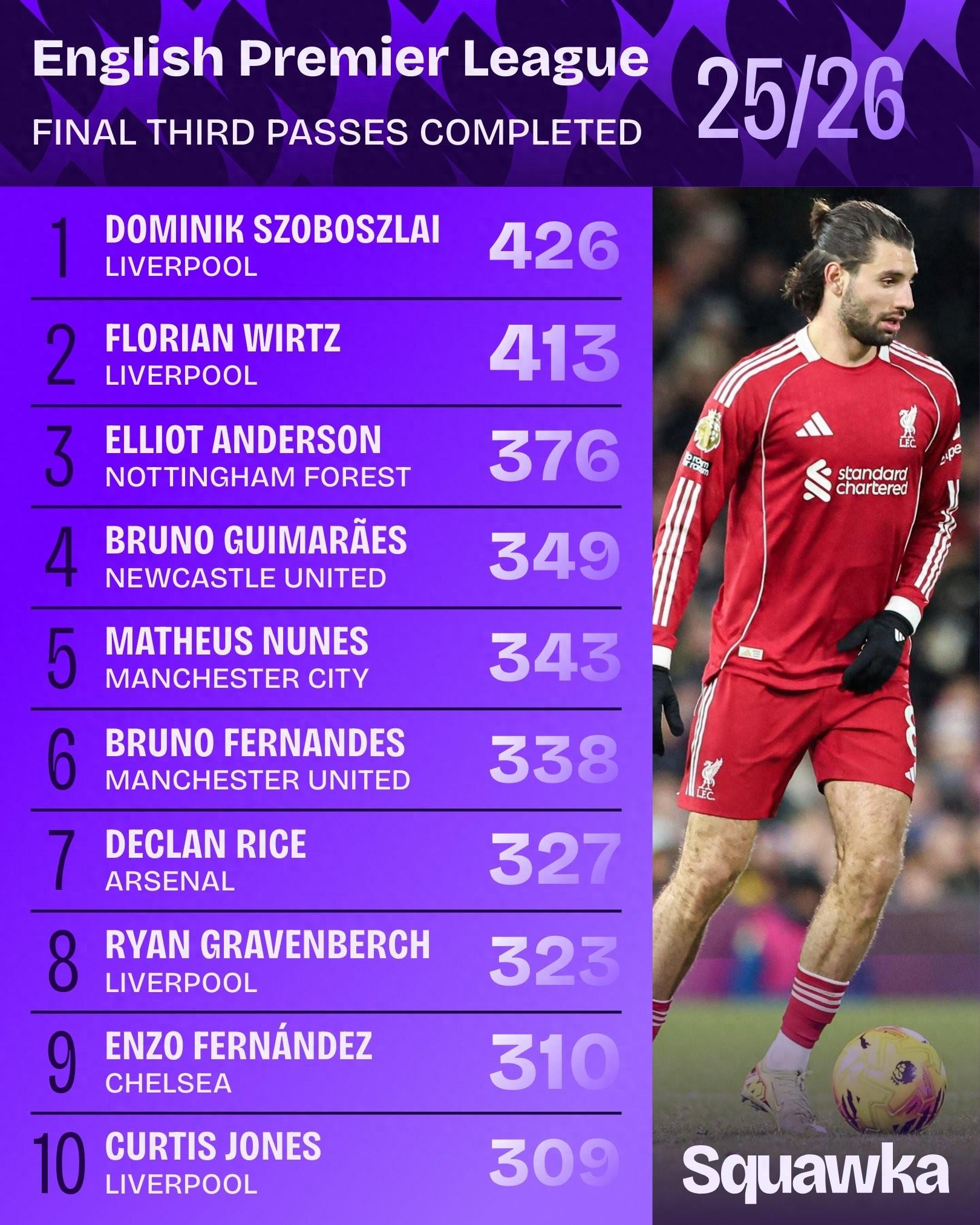 週三,知名數據機構Squawka統計了本賽季英超進攻三區成功傳球數據,索博斯洛伊、維爾茨位列前二,利物浦有4人進榜單前十名。