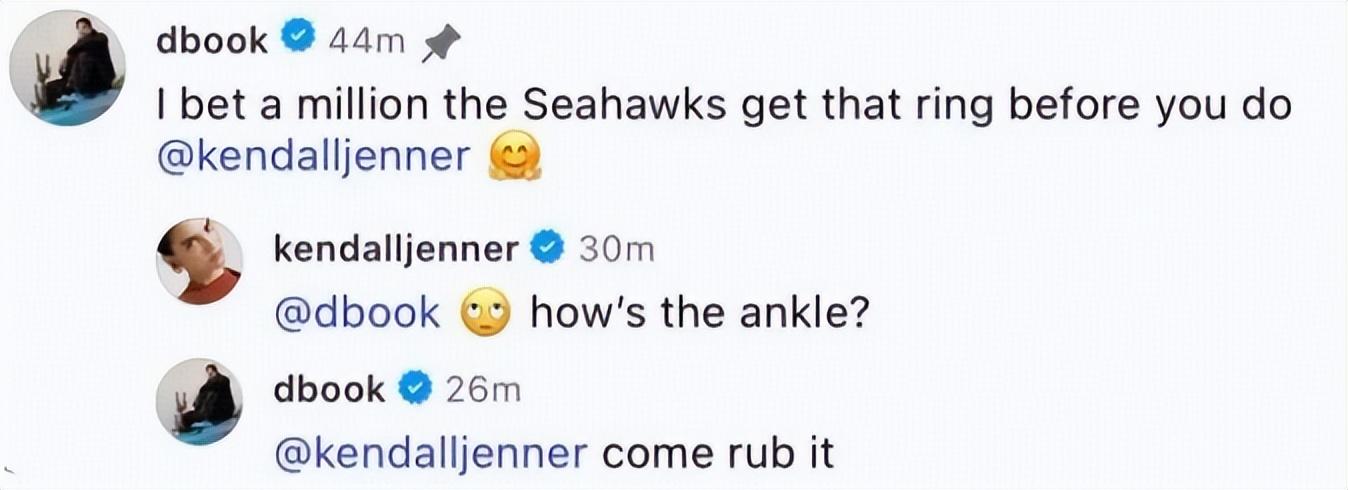 如今,這位NBA巨星發文宣傳,詹娜直接在評論區回應:“你的腳踝怎麼樣了?”布克的回覆則是非常曖昧,表示:“你來幫我揉揉它”。