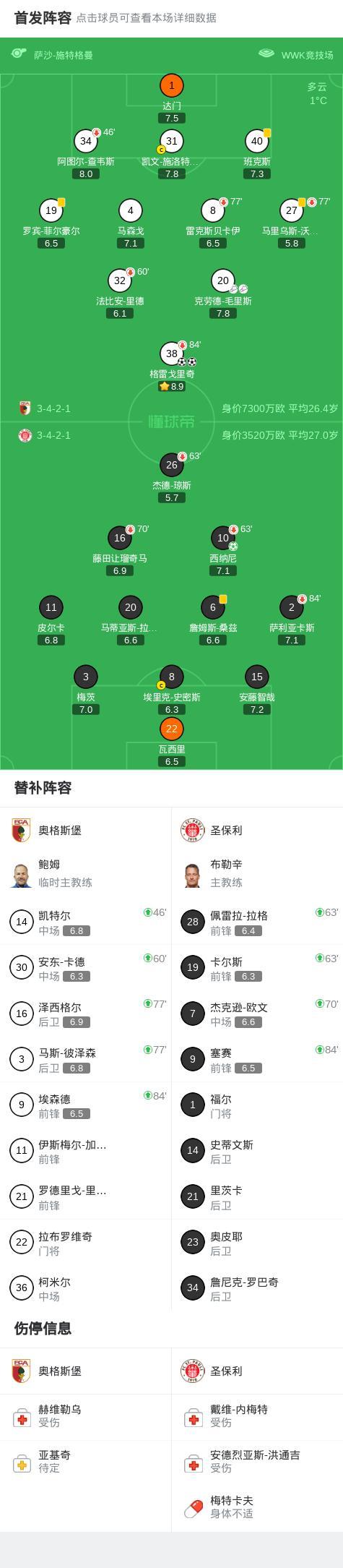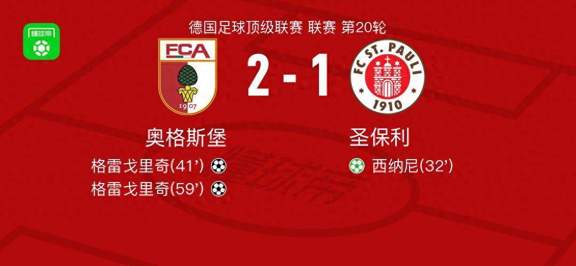 北京時間1月31日德國足球頂級聯賽 聯賽 第20輪,奧格斯堡主場對陣聖保利。奧格斯堡格雷戈裏奇梅開二度。聖保利西納尼破門。最終比分奧格斯堡 2-1 聖保利。