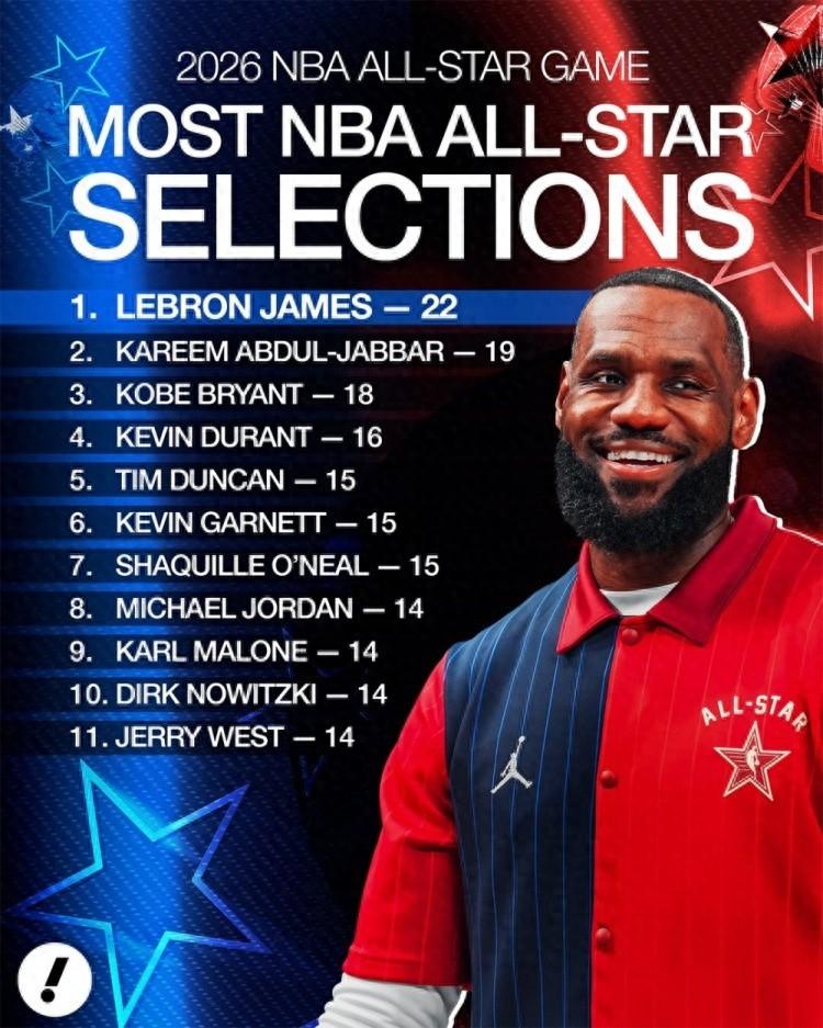 入選全明星總次數:詹姆斯22次擴大優勢,賈巴爾科比分列二三