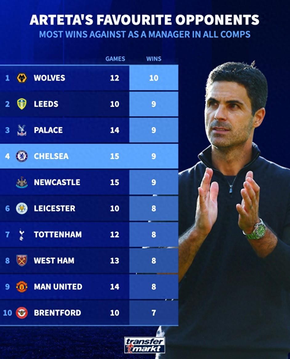 阿爾特塔教練生涯取勝場次最多的10個對手: