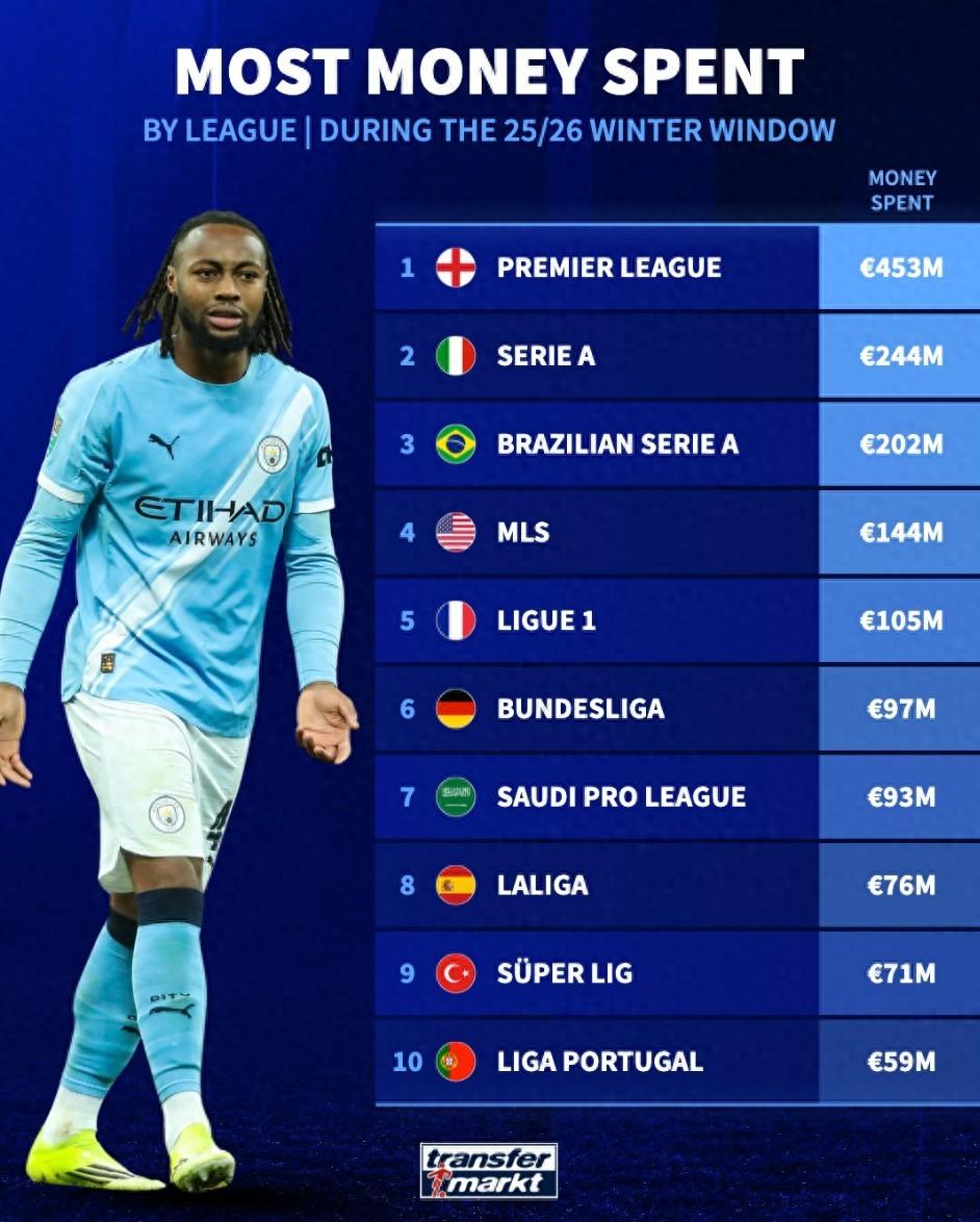 北京時間2月3日,德轉統計出了2026年冬窗轉會支出最高的10個聯賽,英超以4.53億歐元斷檔領先,意甲2.44億歐元第二,巴甲2.02億歐元第三,西甲僅支出7600萬歐元位列第8。