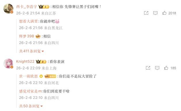 評論區裏中單Knight回覆:“看你表演”,西卡則回覆:“相信你 先鋒賽讓黑子們閉嘴!”。