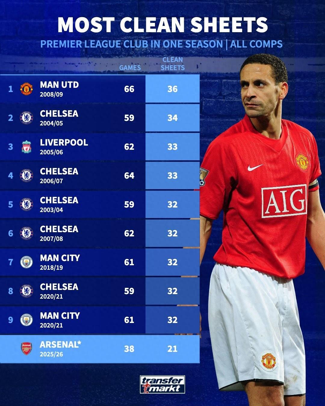 北京時間2月6日,德轉列出了英超球隊單賽季零封榜,2008-09賽季的曼聯以各項賽事66場零封36次排名第一,本賽季的阿森納38場零封21次有望最終躋身前10。