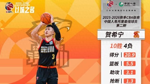 北京時間2月6日,CBA官方公佈了2025-2026賽季常規賽第二期月度最佳球員,深圳隊球員賀希寧成功當選。