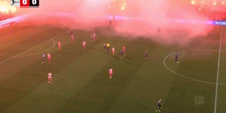 第10分鐘,球迷燃放煙花造成場上煙霧過大,裁判暫時吹停比賽