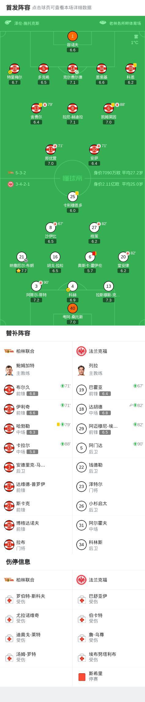 北京時間2月7日德國足球頂級聯賽 聯賽 第21輪,柏林聯合主場對陣法蘭克福。柏林聯合克爾費爾德破門。法蘭克福納撒尼爾-布朗破門。最終比分柏林聯合 1-1 法蘭克福。