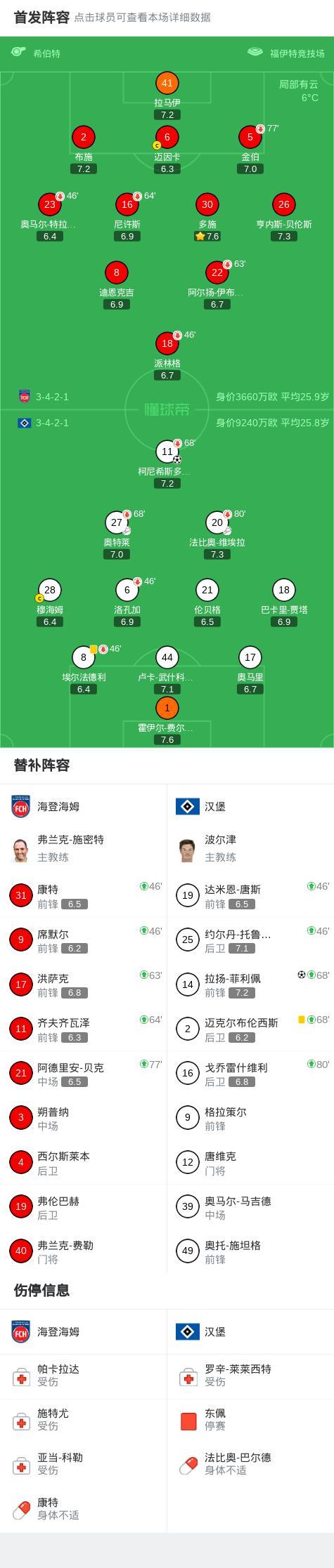 北京時間2月7日德國足球頂級聯賽 聯賽 第21輪,海登海姆主場對陣漢堡。漢堡柯尼希斯多費爾破門,拉揚-菲利佩破門。最終比分海登海姆 0-2 漢堡。