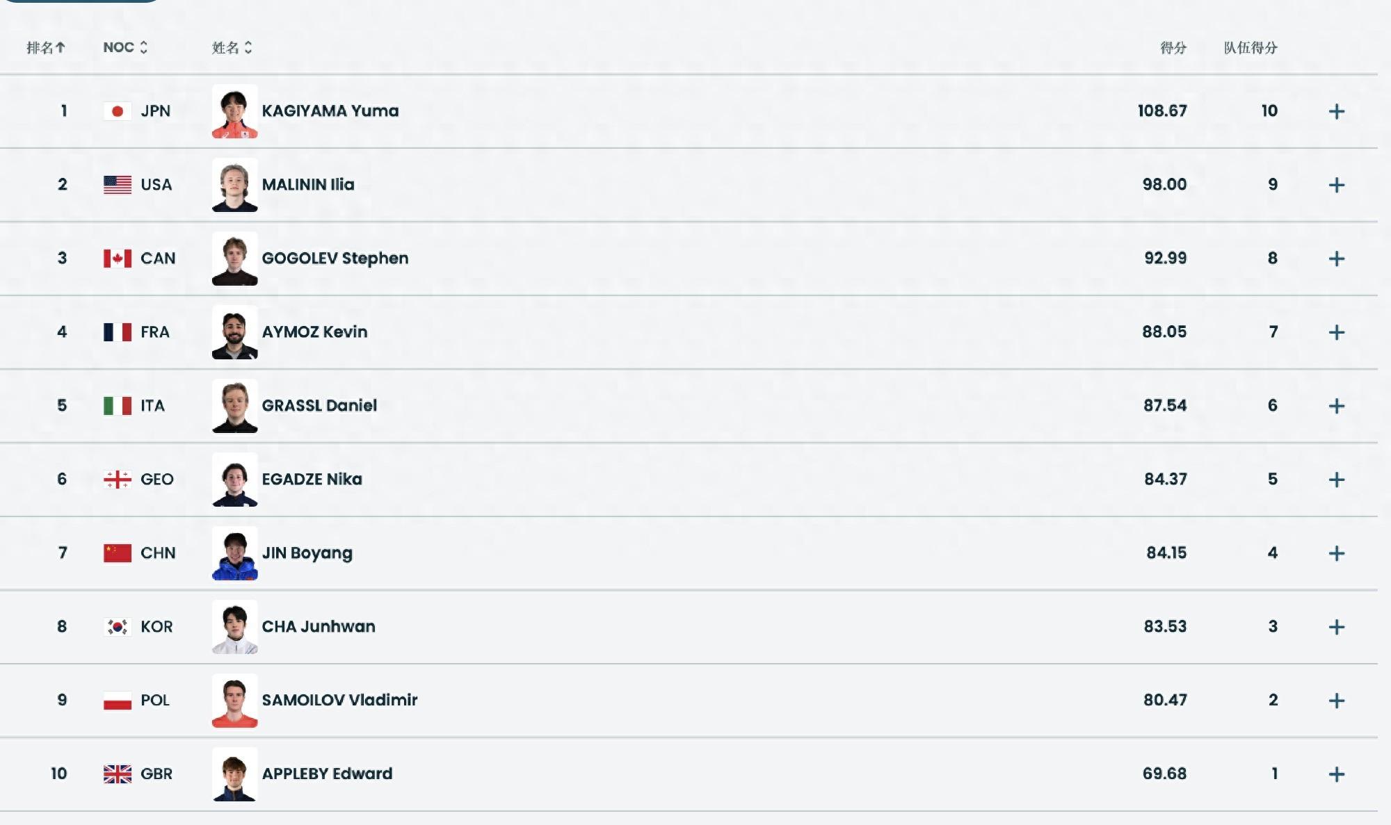 在男子短節目項目中,金博洋得到了84.15分,在所有選手當中排名第7位。