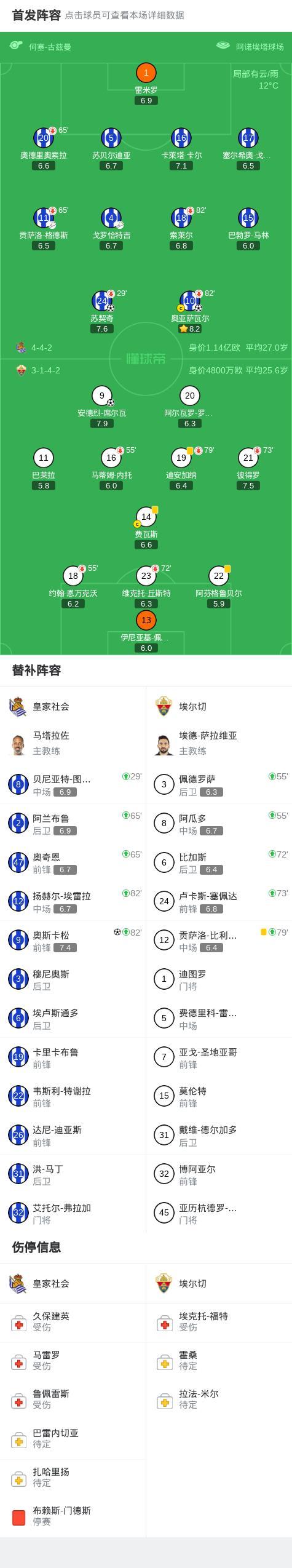 北京時間2月8日西班牙足球甲級聯賽 聯賽 第23輪,皇家社會主場對陣埃爾切。皇家社會蘇契奇破門,奧亞薩瓦爾破門,奧斯卡松破門。埃爾切安德烈-席爾瓦破門。最終比分皇家社會 3-1 埃爾切。