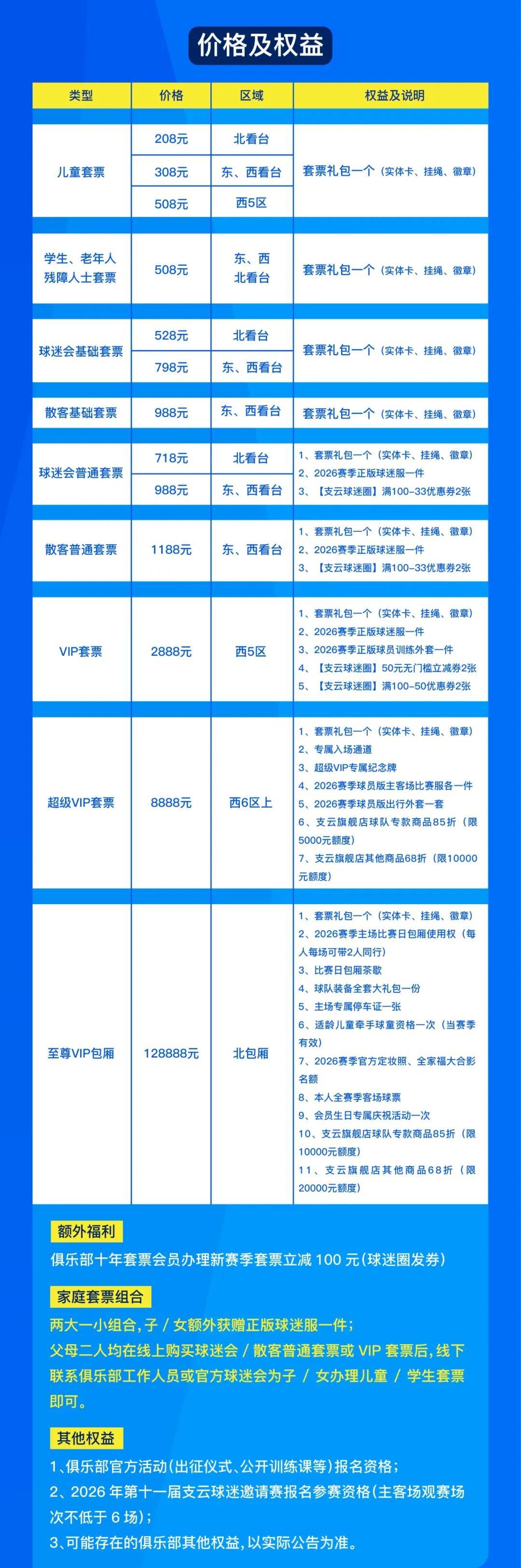 北京時間2月9日,南通支雲2026賽季主場套票已開售,散客票988元、1188元。