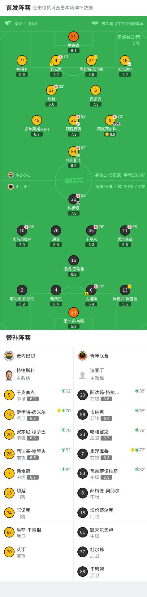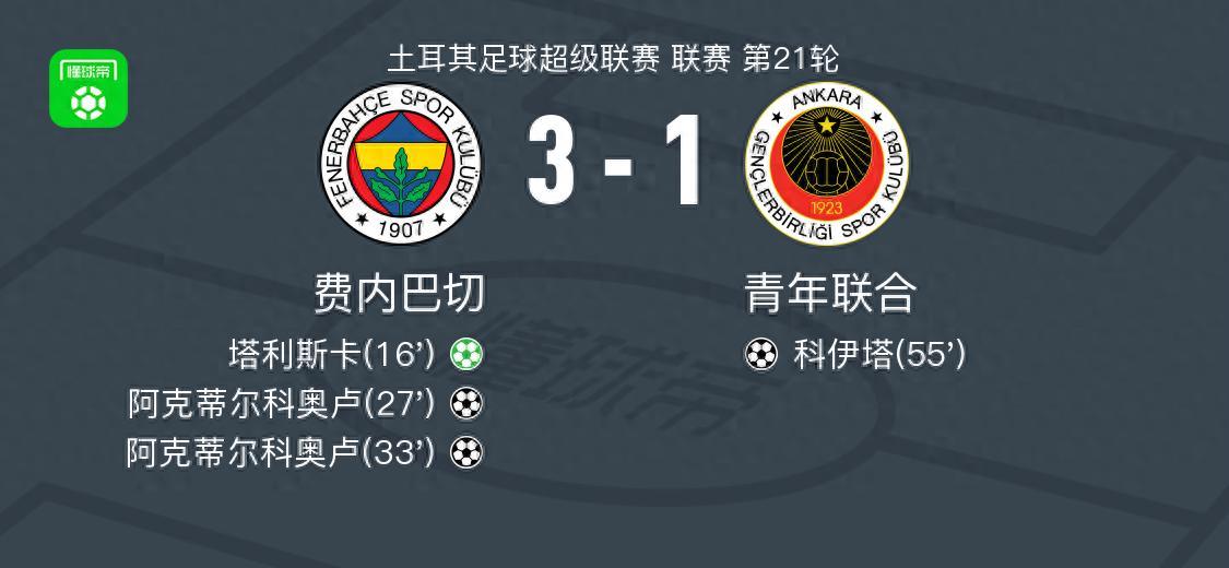 北京時間2月10日土耳其足球超級聯賽 聯賽 第21輪,費內巴切主場對陣青年聯合。費內巴切塔利斯卡破門,阿克蒂爾科奧盧梅開二度。青年聯合科伊塔破門。最終比分費內巴切 3-1 青年聯合。