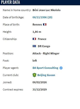 德轉顯示,恩科洛洛與北京國安簽署了一份爲期4年的合同。