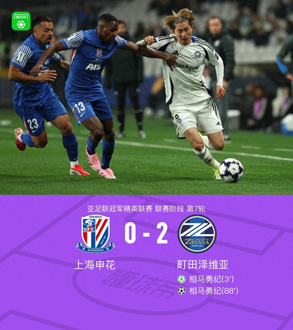 北京時間2月10日亞足聯冠軍精英聯賽 聯賽階段 第7輪,上海申花對陣町田澤維亞。上半場金順凱開場23秒送點,相馬勇紀點射破門。下半場尾聲相馬勇紀梅開二度。最終申花0-2不敵町田澤維亞提前一輪出局,客隊提前一輪晉級。