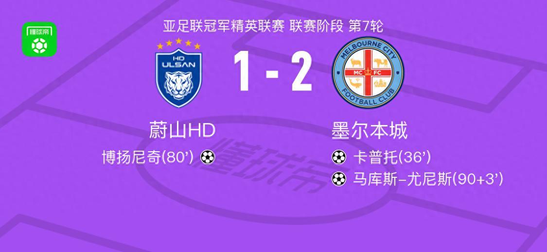 北京時間2月11日亞足聯冠軍精英聯賽 聯賽階段 第7輪,蔚山HD對陣墨爾本城。蔚山HD博揚尼奇破門。墨爾本城卡普託破門,馬庫斯-尤尼斯破門。最終比分蔚山HD 1-2 墨爾本城。