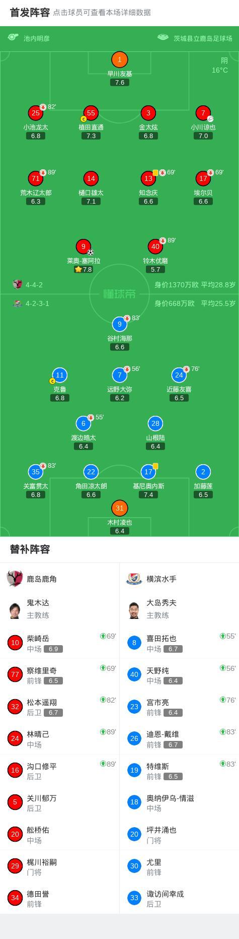 鹿島鹿角1-0橫濱水手,萊奧-塞阿拉制勝,迪恩-戴維失良機