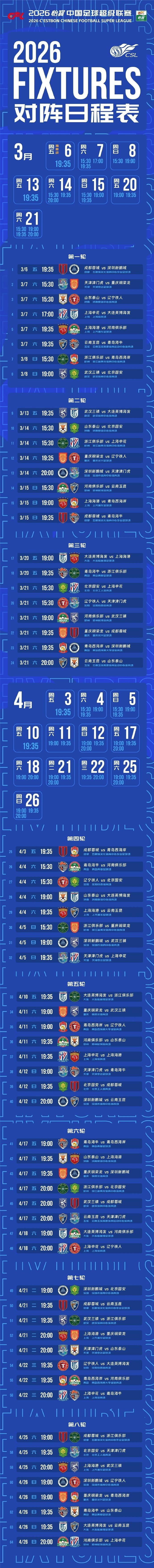 2026賽季中超聯賽將從3月6日開戰,在11月8日結束比賽。